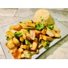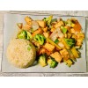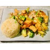 tempura tofu, broccoli, vegetable mix grilled with teriyaki sauce served with fried rice, house soup or house salad