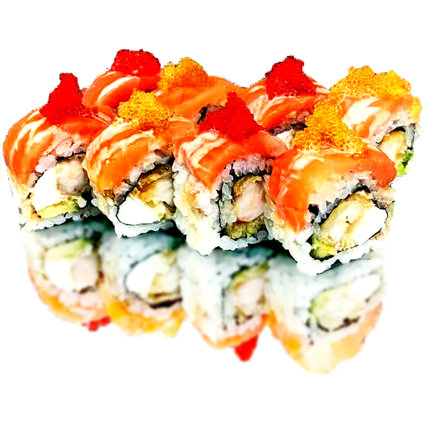 fried shrimp, avocado, cream cheese topped with smoked salmon and caviar