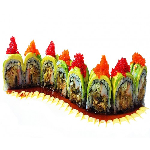 bbq style eel, crab meat, cucumber topped with sliced avocado & caviar
