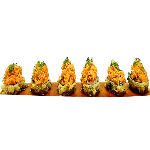 spicy tuna, yellow tail, avocado, cream cheese rolled and deep fried topped with baked carb