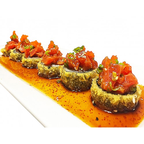 crab meat, salmon, avocado rolled and deep fried topped with spicy tuna, cavia &green onion